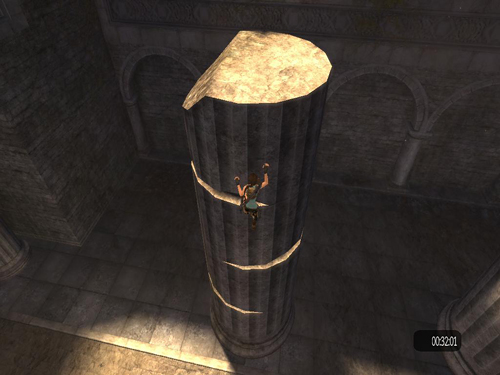 Head for the end of the room farthest from the entrance and climb the column on the right. If you climb up its left side, you can climb straight to the top without having to circle around it. This is the fastest way to get to the upper level.