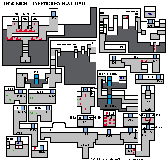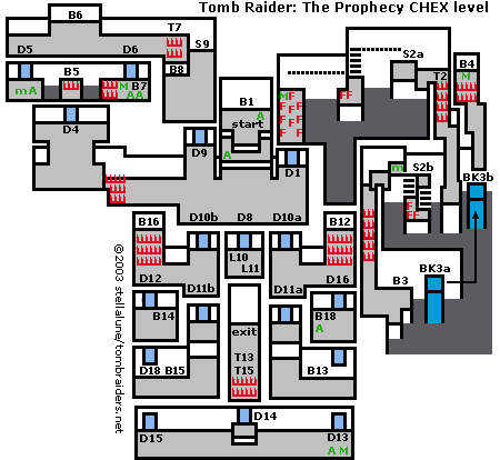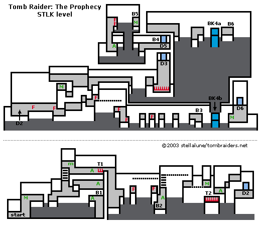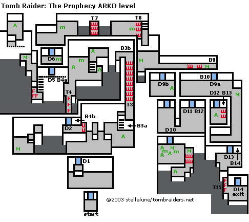 NOTE: Letter designations for buttons (B#), switches (S#), doors (D#), etc., in the text refer to labels on the corresponding level maps. The buttons are numbered to match their corresponding doors (e.g., button 1 opens door 1, switch 3 disarms trap 3, etc.). All pickups are marked on the map (I hope). Enemies and some hazards are noted in the walkthrough but not on the maps.