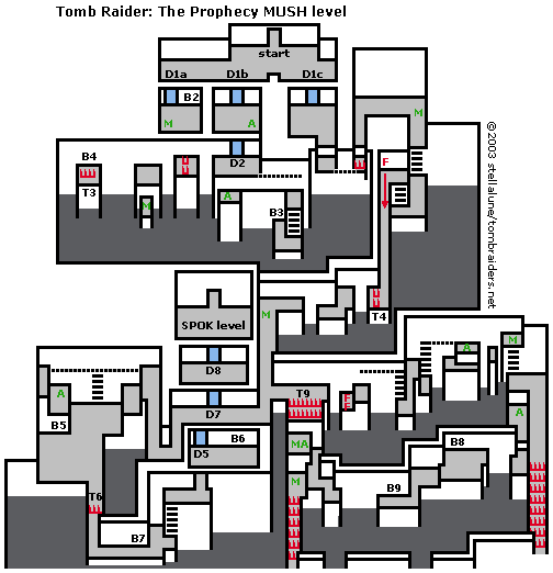You start at the bottom left corner of the map. Go right then up, along the rim of a chasm. Get the large medipak and continue right. Jump the gap and fight a shadow and a skeleton. Climb the ladder and pick up a small medipak and Uzi ammo. Hop down onto the ledge below the spikes (T1), shoot another skeleton and pick up Golden Gun ammo. Drop to the ledge below and fight a third skeleton. Pick up the Uzi ammo and press the button (B1) to disarm the spike trap (T1) above.