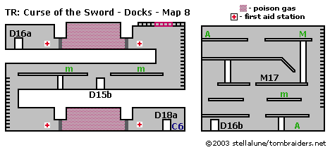 There's a big, green über-zombie in here. If you enter without using the vents to move the poison gas, the monster pummels Lara and won't let her pass. Now he's too busy choking on the gas to bother her. Quickly run through and out the other side. Use the first aid station to restore full health. There's a save crystal (C6) to the right of the open door (D18a). Save and go through.
