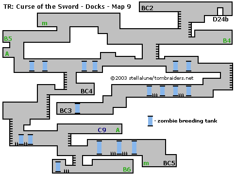 Now, return to the top right of the map: Climb the ladder out of this room. Go left, climb up one level and continue left past the broken tanks. Climb the ladder on the left wall and take a running jump across the gap. (Don't backflip from the ladder or Lara will land in the broken glass.) Go right, climb the next ladder, roll under the overhang near the battery-charging machine (BC4). Climb the ladder above and take a running jump to the right. Grab the edge and pull up. Continue right to the next overhead ladder. Climb up. Keep going right to the two ladders above. Climb the ladder you can reach, go right and exit through the "Bio-Lab 1" door (D24b).