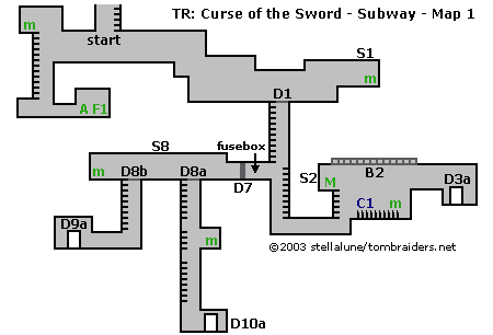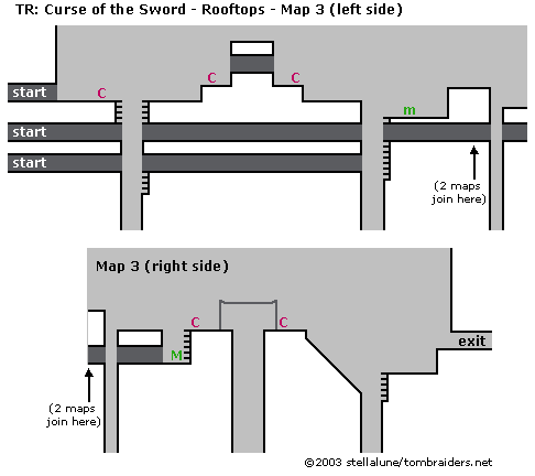 NOTE: Switches are numbered to match their corresponding doors, ledges, etc., (e.g., Switch 1 opens Door 1, Switch 3 extends Ledge 3, etc.). All pickups are marked on the map. Enemies and some hazards are noted in the walkthrough but not on the maps