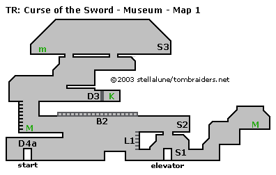 You begin the level at the lower left corner of the map, near Jane and a locked door (D4a). Go right, past the huge dinosaur skeleton and over a low wall. Continue right, underneath a platform with recessed ladder rungs (L1), to the elevator, which isn't working yet. Use the red switch (S1) to extend the ladder rungs you just passed. (To use the switch, position Lara in front of it and press A.)