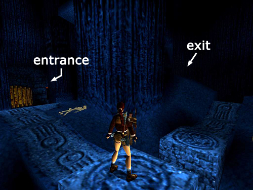 This room is laid out in the shape of a square. Go around to the side farthest from the entrance. Step into the doorway with the skeleton and immediately roll and run out to either side to avoid the boulder that rolls down the passageway toward you. (screenshot) Pick up the flares (20) among the bones and follow the hallway where the boulder came from, jumping over 3 spike pits along the way. (The grate in the floor doesn't open.) Soon you'll emerge on a ledge overlooking the BLUE CAVE.