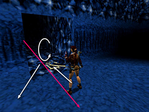 LEDGES ABOVE THE BLUE CAVE: Pull the switch on the thick, square column to open the double doors below. Move to the left edge and take a carefully angled standing jump onto the ledge jutting out of the left side of the column. Move to the end of this ledge and take a running jump to the ledge with the M16 clips (21) ahead on the left. After making the pickup, move to the middle of the ledge where it slopes downward in a V. If you safety drop here where the ledge is a bit lower, Lara won't take any damage. (screenshots)