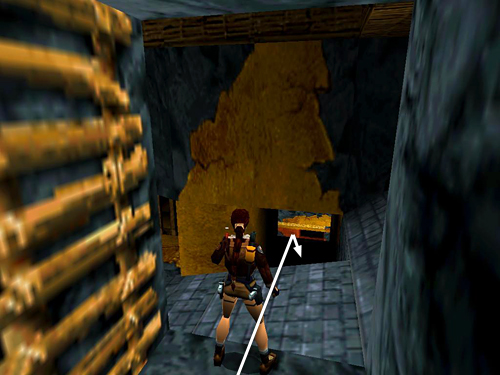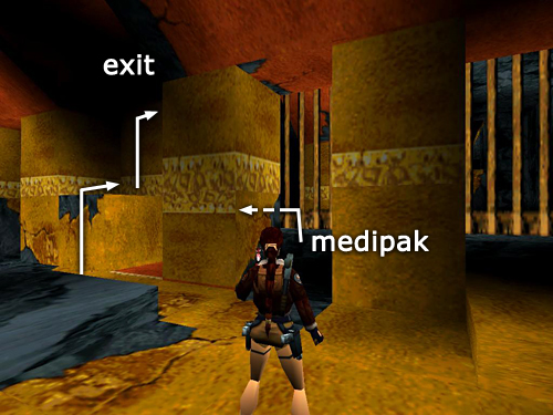 DOUBLE DOORS/ORANGE-AND-GOLD ROOM: Enter the room beyond the gate. Near the back of the room on the left is a barred alcove overlooking a room with a pool of molten gold. There's a large medi pack (25) here on the floor. Grab it and backtrack to the climbable ledge on the right. (Both the alcove and ledge are shown in this screenshot.) Climb through the opening above and drop onto a ledge in the gold pool.