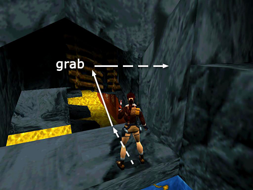 RIVER OF MOLTEN GOLD: Walk to the end of the first ledge and take a running jump over the deadly molten gold to the next ledge. Move to the far left corner of this ledge and jump over to the rocky ledge on the left. Jump up the slope and then walk out onto the block on the right. Hop back and take a running jump to grab the back side of the angled block near the wall. Pull up, slide down the other side of the block, nearly to the bottom. Then jump to land on the angled block in the corner. Immediately jump again to land on the ledge with the grenades (26). (screenshots)