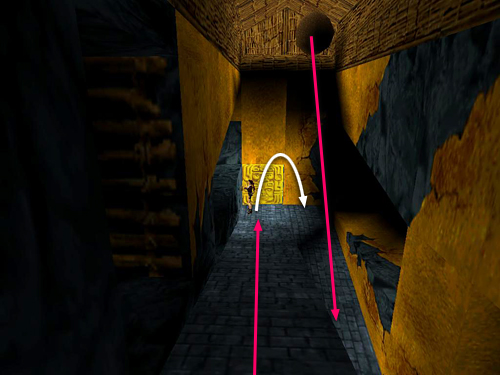 Both doors out of this area lead to the same place, but to get all the pickups, you'll want to go this way: Climb down the ladder inside the doorway near the button until Lara is still hanging on but her feet are no longer on the ladder. Traverse to the left and drop down between a pit of molten gold and another button. (screenshot) Press the button to open the golden door at the other end of the room. Immediately pivot slightly to the left and then backflip to avoid both the pit and the boulder that rolls down from the right. (screenshot)