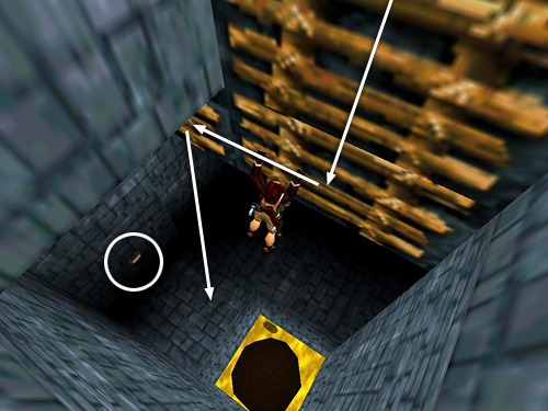 Ahead is a section of breakaway tiles with deadly molten gold below. Beyond that is a short slope and two converging spiked walls. One comes in from ahead, the other from the right. Instead of trying to outrun the spiked walls, run across the breakaway tiles, slide down the slope on the other side, and hurry into the hallway on the left. Wait there as the first spiked wall moves past you heading toward the breakaway tiles. If you like you can shoot the 2 rats (2-3) nibbling on Lara's boot laces, but don't let them distract you from the spikes. Once the first wall passes, move into the space where it originated. You'll be safe here as the second spiked wall moves away down the long hallway. Step out and shoot a third rat (4) off to the right. Then pick up 2 sets of automatic pistol clips (5-6) on the floor to the left, near where the second wall originated. (screenshots)