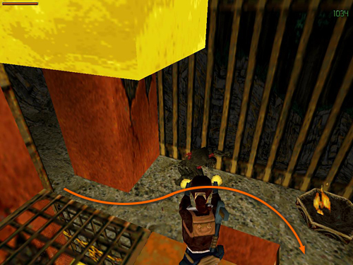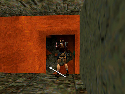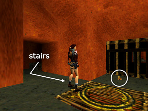 Climb the stairs near the grates where you found the flares and ammo (screenshot) and continue along the hallway to a T-intersection. Turn right here. Don't jump over the slope ahead or Lara will land in the spikes beyond. Instead take a standing jump up to the flat spot on the right, where you'll find more automatic pistol clips (19). (screenshot) Hop back down into the hallway and head down the stairs and around the corner to find SECRET #1, the gold coins (20), sitting in the barred alcove. (screenshot)