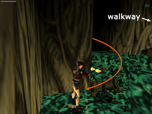 NOTE: It's possible to lure the guardian across the bridge and then pull the switch to retract the bridge, trapping the monster on the switch side. You can then either climb onto the block to kill it or safety drop into the pit and climb out the other side. However, once you pull the bridge lever, the area reverts to its previous state, and the ramp leading up to the guardian's building disappears. So you won't be able to get the medi pack and grenades unless you do it before using the switch in the bridge room.