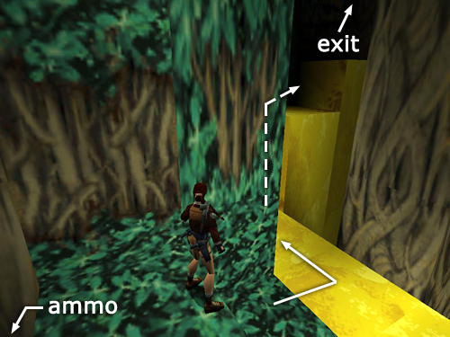 When the sasquatch is dead, turn around, go back inside the clump of trees and head to the left onto the wooden bridge. Turn left and do a tricky running jump across the molten gold to grab the left side of the leafy green ledge. To line up this jump, position Lara at the back edge of the bridge with her left hand just touching the tree trunk that supports the bridge. Don't get too close or she'll bump into the tree when you do the running jump and fail to reach the ledge. Pull up and claim 2 sets of automatic pistol clips (22-23). (screenshots)