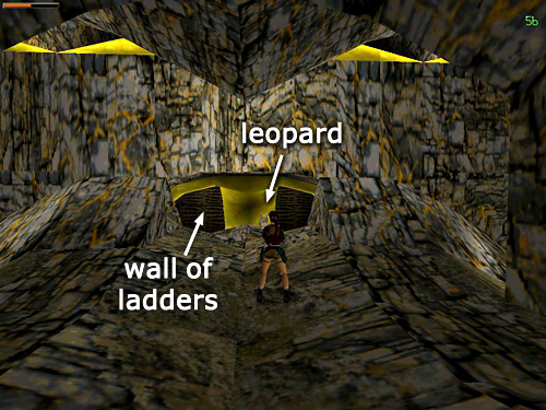 Exit the building where you found the large medi pack and M16 ammo and continue over the rocky hill, past where you shot the last leopard, to a wall of ladders (also shown in the previous screenshot). Climb up.