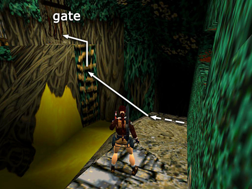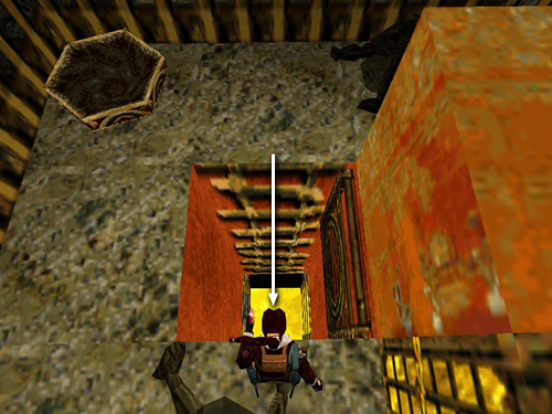 Even if you don't kill the warrior, you should jump across to his ledge since there's also a small medi pack (28) in the far right corner. When you have it, take a running jump back over the golden stream to the side where you started. Turn left and enter the building.