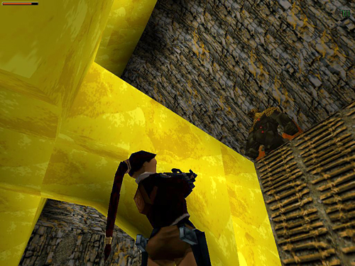 NOTE: If you've killed the Inuit warriors, fighting the sasquatch will be easier. Just take the large medi pack, run forward, roll and wait for the sasquatch to come around toward you. Then shoot it as it crosses the room. (screenshot) When it's dead, climb back into the doorway to shoot the sniper in the cage above.