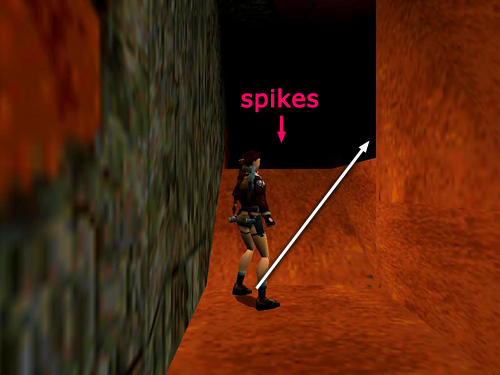 AREA ABOVE THE CAGES: In the hallway beyond the cages, head to the left first. Slide down the ramp and jump to grab the ladder. Climb all the way down into the spike pit at the bottom. Let go and walk through the spikes to get the Uzi clips (16). Climb back up the ladder past the spot where you grabbed on before. Position Lara so her hands are on the third rung from the top and backflip to land on the ledge behind her. Or, climb to the left and dismount on a ledge with more spikes. Turn around, walk through the spikes, and take a standing jump over the opening to the ledge opposite the ladder.