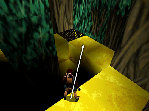 Slide down the ramp straight ahead (not the one on the right) to land on the flat ledge below. Take a running jump across the gold stream. Climb onto the block straight ahead then up onto the ledge on the left.(screenshot) The rightmost alcove on this ledge contains the exit ramp. In order to avoid injury in the long drop coming up, angle Lara a little to the left as you jump forward onto the ramp. (screenshot) Slide down facing uphill and grab the end of the first slope. Drop onto the gold slope below and slide down a series of ramps onto the gold square with the face at the bottom of the TREETOPS area.
