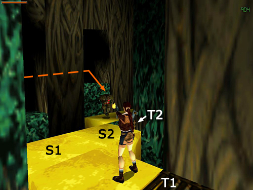 GOLD WALKWAY WITH TRAPDOORS (again): As noted earlier, walking or jumping over certain squares on this walkway triggers the opening or closing of the various trapdoors. Move onto the second square in the walkway to close the first trapdoor. Then avoid the third and fourth squares by jumping diagonally onto the fifth square, just before the trapdoor. This way the trapdoor will remain closed. (screenshot) Walk over the trapdoor, draw weapons, and move two squares forward. When you do, a sasquatch (19) emerges from the dark opening in the greenery ahead on the right. Shoot it as it approaches. Then step onto the square nearest the second trapdoor to draw out a second sasquatch (20). Back up carefully as you shoot it. (In this screenshot the squares that trigger each sasquatch are marked 'S1' and 'S2', the trapdoors 'T1' and 'T2'.)