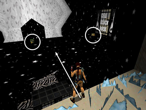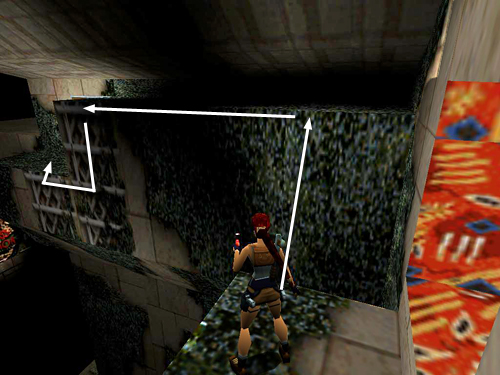 NOTE: When making this jump, be sure to aim for the left side of the slope. If Lara lands too far to the right, her feet will touch the slope below before she can grab and she'll slide down to the floor. Then you'll have to climb back up again.