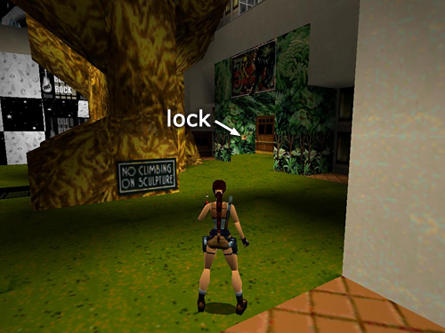 Starting in the doorway where you enter the ATRIUM from the hallway near the HOTEL ROOMS, turn right and follow the black-and-white tiled walkway about halfway across this side of the room. Turn left to face the huge, golden sculpture. Then take a running jump to grab the sculpture just below the large medi pack (18). Climb up and take the medi pack. (screenshot) Turn around and take a running jump back to the black-and-white walkway. Follow it around to the right and enter the ZOO.