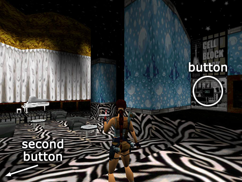 BLACK-AND-WHITE "CELL BLOCK ROCK" LOUNGE: Return to the ATRIUM WITH THE HUGE SCULPTURE, go to the right and enter the doorway framed with black-and-white tiles. Inside, press the 2 buttons in the alcoves decorated with blue bubbles. (screenshot) This raises the curtain on the stage. As you approach the stage, 4 club-wielding goons (9-12) climb over the black-and-white blocks and attack. You can put some distance between Lara and them, but be careful not to back up too far. If you go all the way up the stairs, another bad guy (13) enters and starts shooting. I prefer to wait and deal with him on the way out. Pick up shotgun shells (37) from one of the club goons, plus a small medi pack and flares (38-39) lying on the floor.