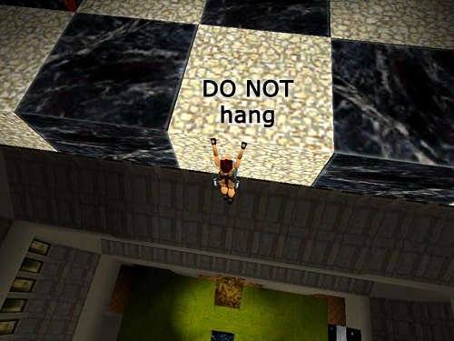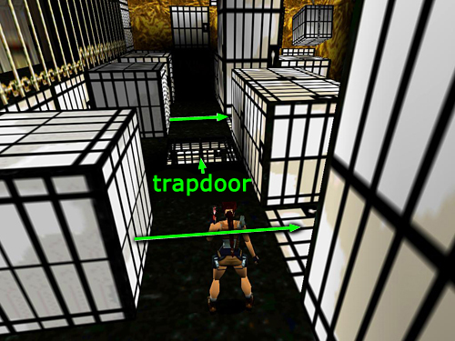 WARNING: Do not try hanging from the edge before you jump or dive. The trapdoor is triggered by Lara moving through the square directly in front of the spot from which you dive, and it only cycles once. So if Lara hangs from the edge and then pulls up, the trap door will open and close. (screenshot) Then when you attempt to dive, the door will remain closed and Lara will dive to her death.