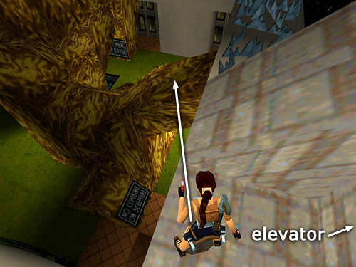 Alternatively, after climbing down from the little room with the shotgun shells, pull the elevator switch, roll, run around to the left and jump at the edge of the elevator shaft to grab the ladder on the back wall. Then climb down into the elevator as it rises. Lara should climb right through the ceiling of the elevator ending up inside it. If you'd rather not "cheat" this way, instead climb all the way up the ladder and backflip onto the ledge where you found the shells and medi pack earlier. Then climb down the ladder on the other side and drop back into the blue-tiled hallway. By the time you get there, the elevator will have risen and you'll be able to run inside.