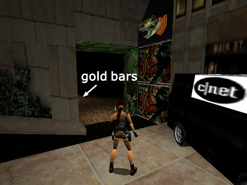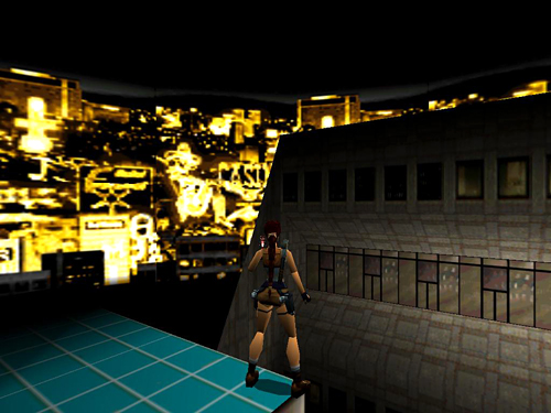 After killing the dinosaurs, move to the corner of the building just beyond the first c|net van. (screenshot) Use the corner bug here (screenshot) and Lara should pop up to the highest roof in the area, providing a spectacular view of Vegas at night—and Winston down below if you haven't locked him in the bathroom. ;) (screenshot/screenshot) Thanks to Kamila for sharing this find.