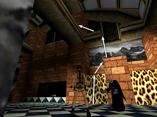 BUG WARNING: It is possible to descend by safety dropping from the walkway on the right side of the atrium onto one of the small, cement ledges below. However, doing this may cause a bug that will prevent you from finishing the level. To avoid this problem, just make sure you enter the ZOO before climbing down to the lower levels. Once you've done that, you can explore in any sequence you like. For details, see the footnote below.