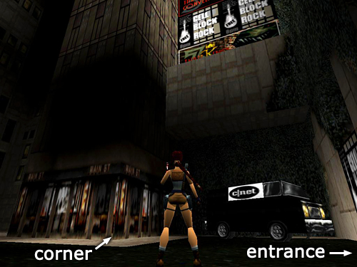 EXPERT CHALLENGES - DARK STREET WITH T. REXES: The area where you encounter the two dinosaurs is a great place to experiment with some fun game glitches. The first exploit, originally submitted by JJRiddlemeister and later refined by Dimitrij, goes beyond the usual "Expert Challenge." I haven't been able to reproduce it myself, but I've heard from a couple of players who have. Apparently it's possible get a boost from one of the dinosaurs onto the high, flat roof of the building opposite the first c|net van. A detailed account is provided on a separate page.