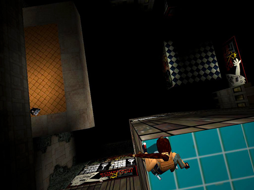 After picking up the health and ammo, run back around to the right toward the hallway with the elevator. Jump over the broken glass, turn left, run past the elevator and then turn right. The monster will be hot on Lara's heels, so take running jumps where it's safe to do so. Follow the blue-tiled hallway down several ramps, jumping over 2 more fields of broken glass on the way. (screenshots)