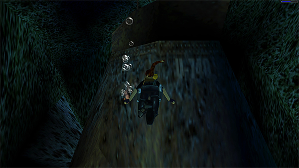 Swim to the middle of the pool and surface for air in the crate room. If you didn't press the button on the wall here earlier, do that now to open the white gate. Now tread water with the button directly ahead and the green crates on Lara's right. Then swim down and forward, and the white gate will be almost directly ahead. Swim through and let the current sweep Lara up the tunnel into the next area. (screenshots)