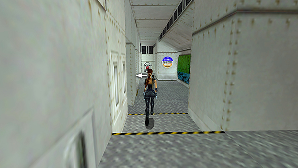 When you come out the other end of the tunnel, 2 friendly dolphins greet Lara. The camera will show a wide-angle view of this area as the current carries Lara to the left, toward the rectangular alcove between the building on the left and the pipeline on the right. Swim into the square opening on the left. Follow the tunnel down to a T-intersection and turn left. Come to the surface for air but don't climb out of the water yet. If you linger near here, one of the dolphins should come and give Lara a boost onto the ledge. (How cool is that?!) This is secret #1, harpoons and 2 large medi packs (16-18). (screenshots)