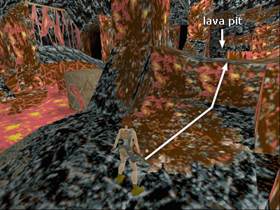 SECRET CAVE IN LAVA PIT: Step off the edge of the step (or hang from the edge and drop) to land on a flat block in the lava pit below. (Again, check the screenshots if you need a visual.) Move to the outer corner of the block and take a standing jump across the lava to the next safe block. Step carefully off the edge or hang and drop onto the ledge below. Position Lara at the outer corner of this block and angle her toward the block in the opposite corner of the cave, where there's a large medi pack (8). Hop back and then take a running jump to grab the edge of the block. Pull up and take the medi pack, which is this level's only SECRET.