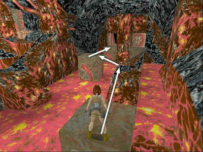 TIMED DOORS & BLOCK JUMPING IN THE LAVA STREAM: Take a carefully angled running jump from the bank of the lava stream to the tan block ahead on the right. (These screenshots show the sequence.)