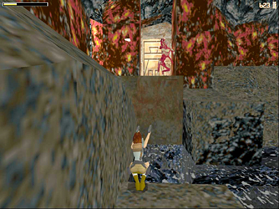 SERIES OF SLOPES ABOVE LAVA POOL: Below is a series of slopes above a lava pool. In order to reach the safe area at one side of the lava pool, you'll need to do a series of sliding jumps. (This set of screenshots shows the details.) Begin by standing on the ledge facing slightly to the left. Jump forward to land on the first slope so Lara slides down facing forward. Near the end of the slide, jump to clear the gap and land on the next slide. Slide again and jump across the next gap to the slope beyond, which angles down to the left. Now hold down the Jump key so Lara hops back and forth between the two angled slopes over the lava stream. Hold the right direction key at the same time so she gradually creeps to the right as she jumps. Stop when she reaches the slightly raised block at the far side of the left hand slope.