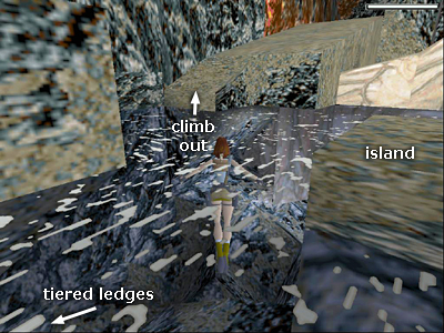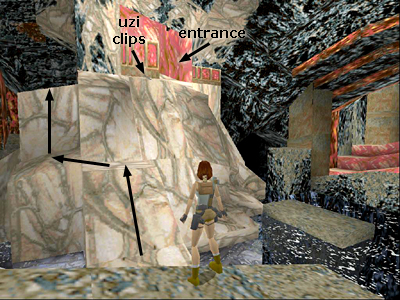 CAVE WITH LAKE & PYRAMID-LIKE STRUCTURE: Surface near where you splashed down and climb out of the water on the right side. There's a mutant (9) lurking on the ledge above. Climb up, kill it quickly before it bombards Lara with fireballs. Then pick up the magnum clips (15) in the corner.