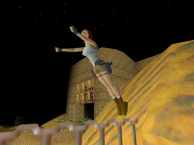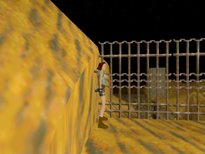 Go to the long fence through which you can see the pool beyond. Position Lara in the left corner (where one of the boxes of shotgun shells was) with her left hand against the fence and the yellow sandy hill behind her. Back up until Lara's back touches the sandy rock (as shown above).