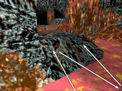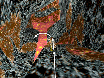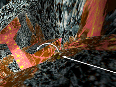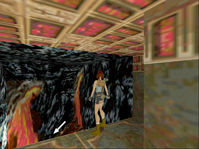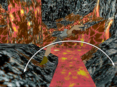 Now hold down the Jump key so Lara hops back and forth between the two angled slopes over the lava stream.