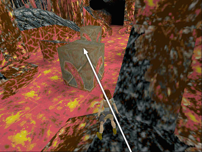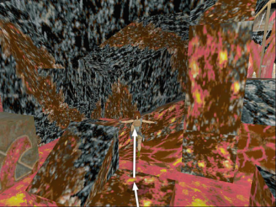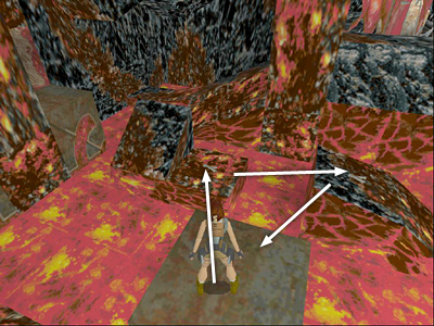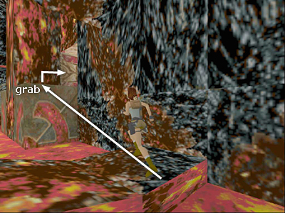 Run up the slope, veering to the left as you run down the path so that Lara is facing the end wall of the cavern. There's more lava ahead, so be careful not to run off the path. Try to aim for the back (right) edge of the last block in the path, as indicated by the pointer on the arrow in the screenshot above.