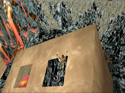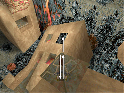 Set up the jump as usual by hopping back from the edge once. Then take the running jump. Press Action while Lara is in the air to alter her trajectory. . .