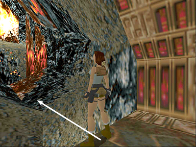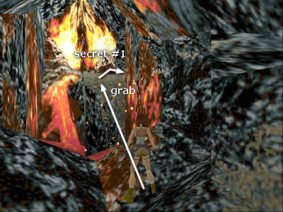 Take a running jump across the lava pool to grab the angled block on the other side. Pull up and enter the cave on the right for secret #1.