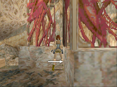 To reach the level exit far below without losing any health, try this simple but not exactly "legal" variation on the fence bug. Position Lara at the corner where the two red lattice panels come together, indicated by the arrow in the screenshot above.